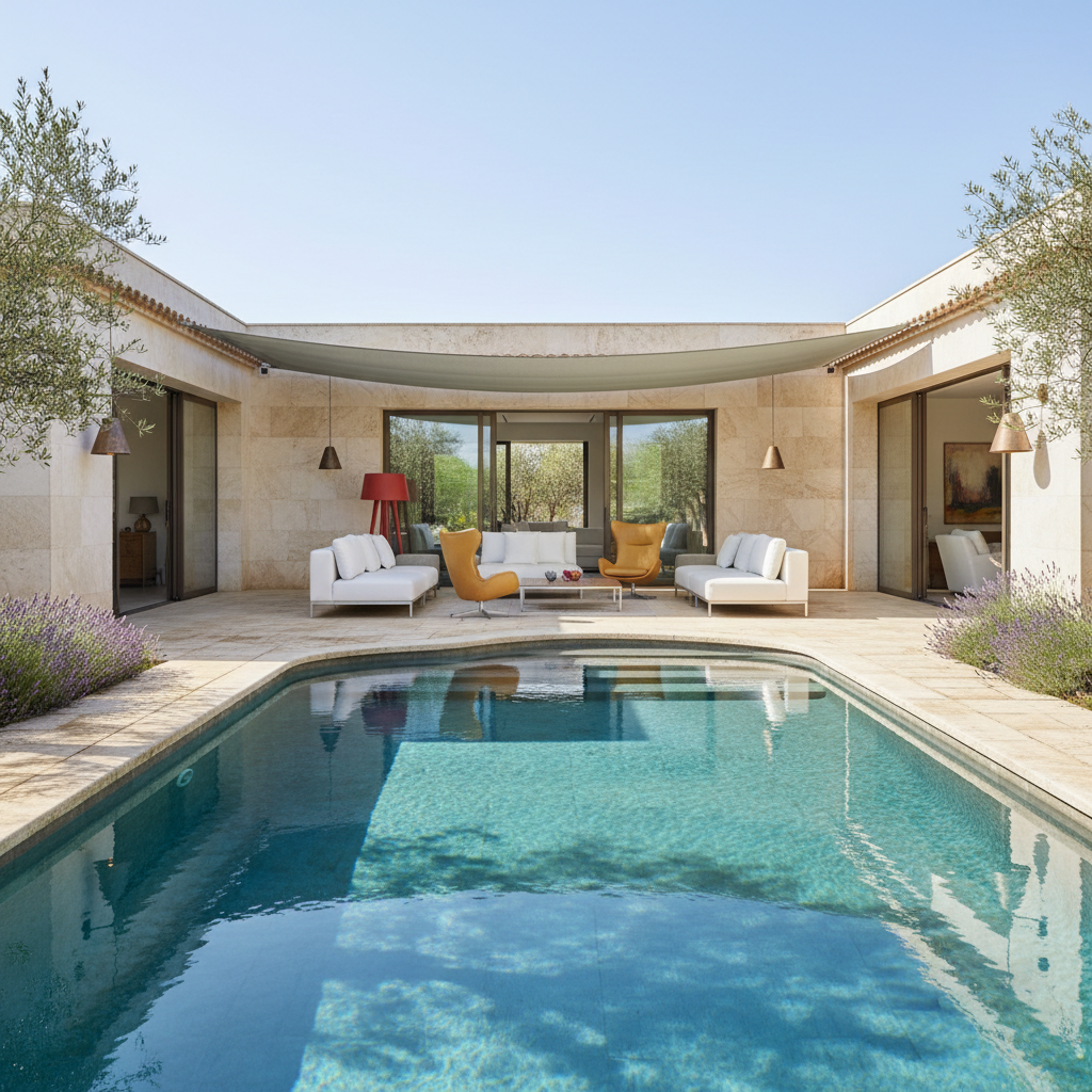 Create a sleek and inviting Pool Area with a Contemporary Mediterranean aesthetic. The space features a large, rectangular pool with a gentle, undulating edge, surrounded by a perimeter of weathered, honey-colored limestone pavers. The walls are clad in creamy white travertine, punctuated by floor-to-ceiling windows and sliding glass doors that lead to the outdoor living space. A spacious sun deck is covered in a plush, gray-green awning, providing shade from the Mediterranean sun. The furniture is minimalist and low-maintenance, with a pair of sleek, white sectional sofas and a pair of matching, high-backed chairs in a soft, golden leather. The surrounding landscape is dotted with olive trees and lavender bushes, their silvery-gray foliage complementing the cool, blue hues of the pool. A floor lamp with a sculptural, terracotta-red shade adds a pop of warm color to the space, while a series of pendant lights in a distressed, bronze finish hang from the surrounding eaves,