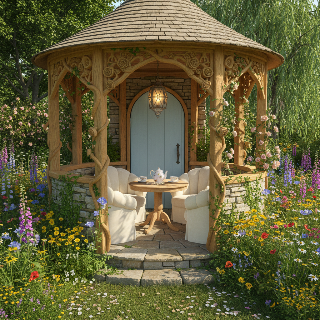 Design a charming Gazebo in Cottagecore style, nestled among lush greenery and blooming wildflowers. The structure features a soft, rounded roof with a warm, honey-colored wooden frame, adorned with intricate carvings of vines and flowers. The walls are made of natural stone, weathered to a moss-covered finish, and the door is painted a gentle, sky-blue hue. The gazebo is furnished with plush, oversized armchairs in a creamy white velvet fabric, arranged around a small, rustic wooden table with a delicate, floral-patterned tea set. A vintage, distressed metal lantern hangs from the eaves, casting a warm, golden glow over the space. The atmosphere is serene, with a soft, whispery breeze rustling the leaves and a sweet, floral scent wafting through the air.