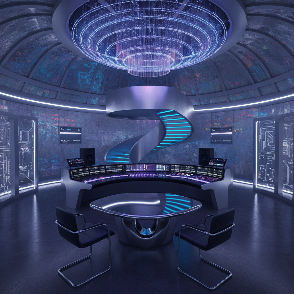 Design a futuristic recording studio with a sleek, high-tech aesthetic, incorporating cutting-edge materials and innovative lighting. The space should feature a predominantly metallic color scheme, with accents of neon blue and purple. The walls and ceiling are clad in a shimmering, holographic finish, while the floor is made of polished, dark-colored concrete. A spiral staircase, reminiscent of a spacecraft, leads to a raised platform where the mixing console and sound equipment are situated. The atmosphere is electric, with a subtle hum of machinery and pulsing LED lights that respond to the studio's acoustics. The room is illuminated by a unique, fiber-optic ceiling that shimmers and changes color in sync with the music being recorded. Furniture is minimal, with a few, futuristic-looking chairs and a low, curved table made of a gleaming, metallic material.