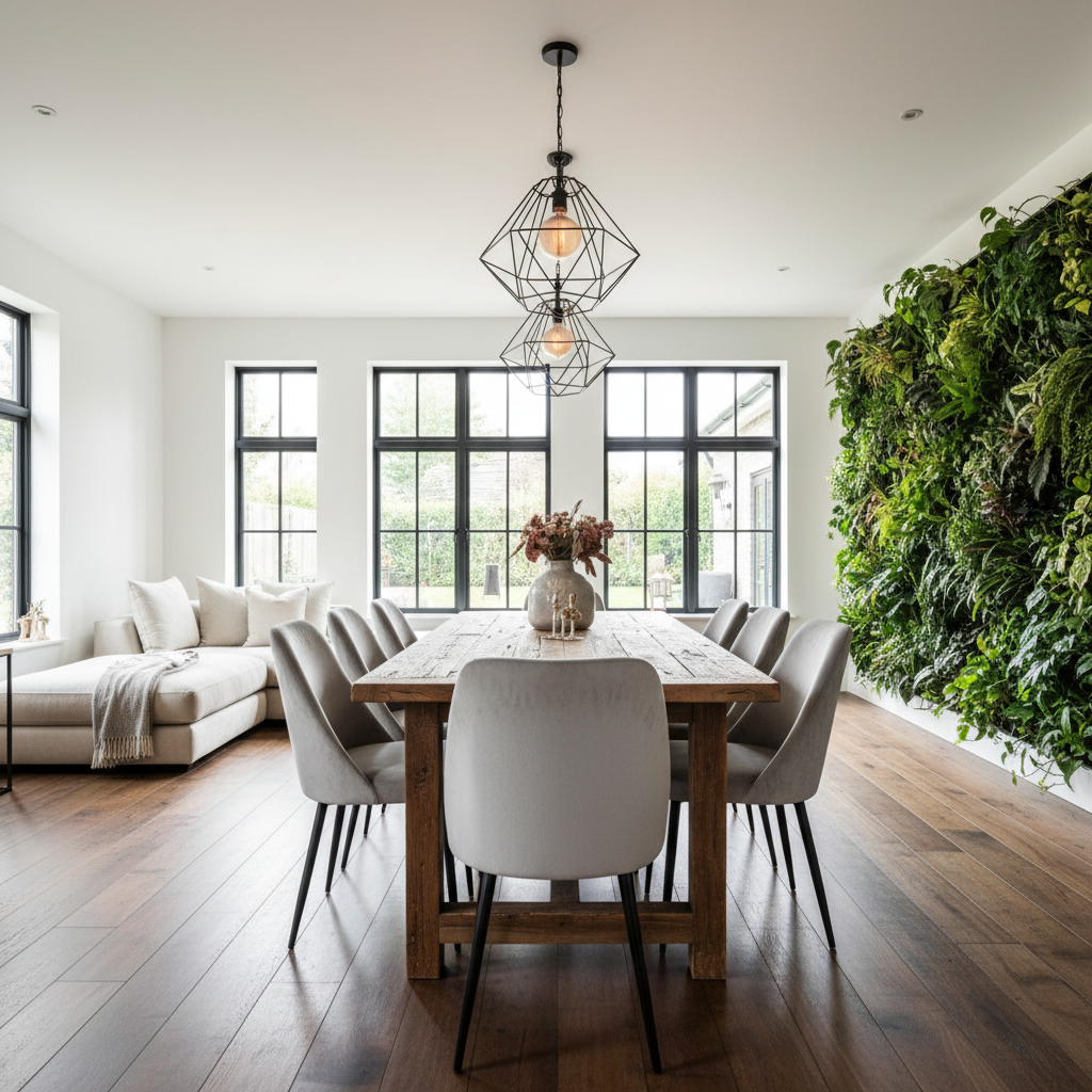 Generate an image of a modern contemporary dining room with a large rectangular table made of reclaimed wood, surrounded by five high-backed chairs upholstered in a light gray velvet fabric. The walls are painted a crisp white and adorned with large industrial-style metal pendant lights suspended from the ceiling. The floor is made of wide-plank hardwood in a warm, dark finish, and the room is filled with natural light pouring in through a wall of floor-to-ceiling windows. A floor-to-ceiling living wall in a lush greenery adds a touch of organic sophistication to the space, and a sleek, low-profile sectional sofa in a neutral color is placed along one wall, creating a cozy reading nook. The overall atmosphere is one of understated elegance and refined sophistication, perfect for a modern family dining room.