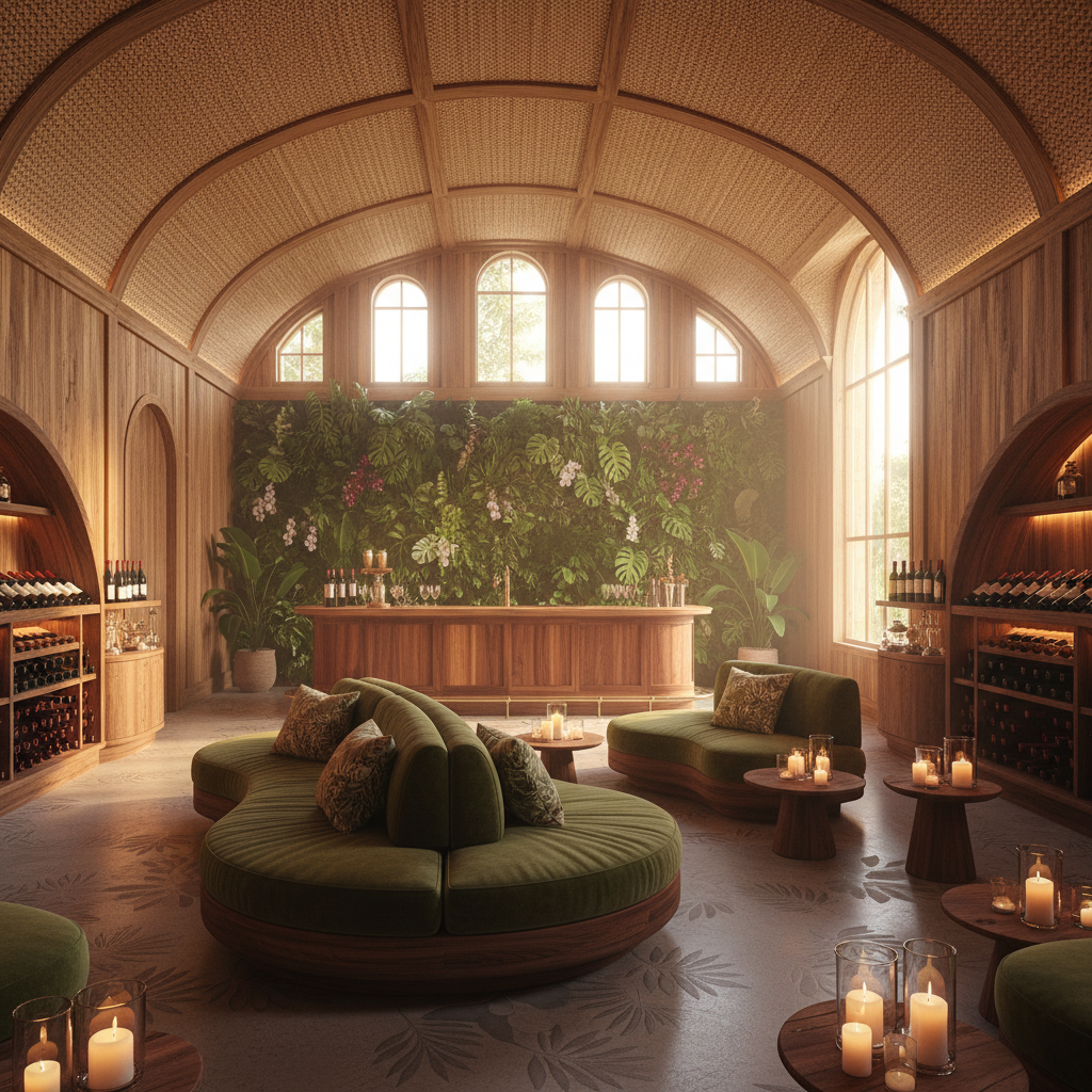 Imagine a wine cellar with a natural tropical twist, where the warmth of the surroundings is balanced by the richness of the wine. The space is dominated by a high ceiling, adorned with woven rattan shades that filter the soft, golden light pouring in through the large windows. The walls are clad in reclaimed teak, adding warmth and texture, while the floor is made of polished concrete, infused with a subtle tropical pattern. The furniture features curved, organic lines, reminiscent of a lush jungle, with a plush, oversized sofa in a deep, mossy green. Rich wood accents, such as a reclaimed mahogany wine bar, complement the space, while a statement piece, a living wall of lush greenery, adds a touch of natural elegance. The air is filled with the scent of exotic spices and the soft, warm glow of candles, creating an intimate and inviting atmosphere perfect for sipping fine wines on a warm evening.
