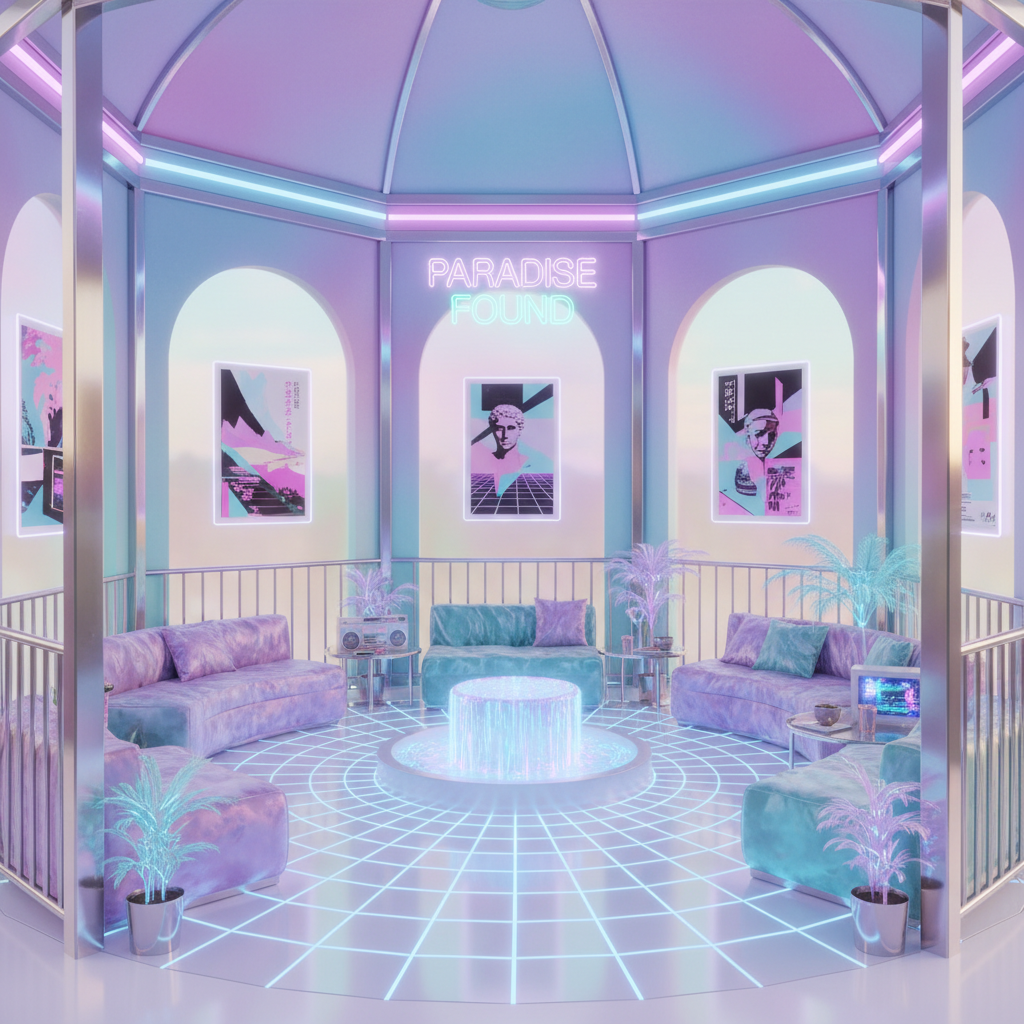 A beautiful Gazebo designed in Vaporwave style. Transform this interior into vaporwave style while keeping walls and layout. Use pastel neons, gradient lighting, chrome or glass accents, and nostalgic 80s-90s digital motifs. Add bold art, grid patterns, and relaxed seating for a surreal, pop vibe. The space features carefully selected furniture, harmonious colors, natural lighting, and thoughtfully placed decorative elements that create a welcoming and aesthetically pleasing atmosphere.